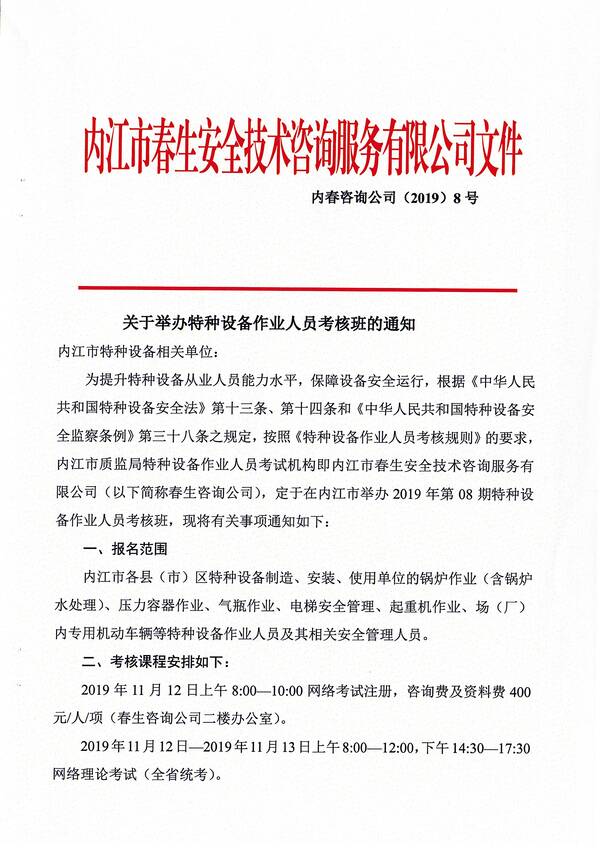 2019年第八期特種設(shè)備作業(yè)人員考核培訓(xùn)班的通知